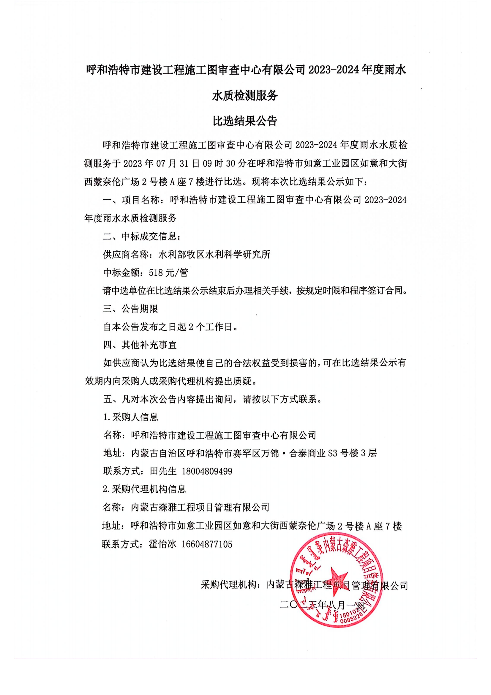 2023—2024年度雨水水質(zhì)檢測服務(wù)比選結(jié)果公告