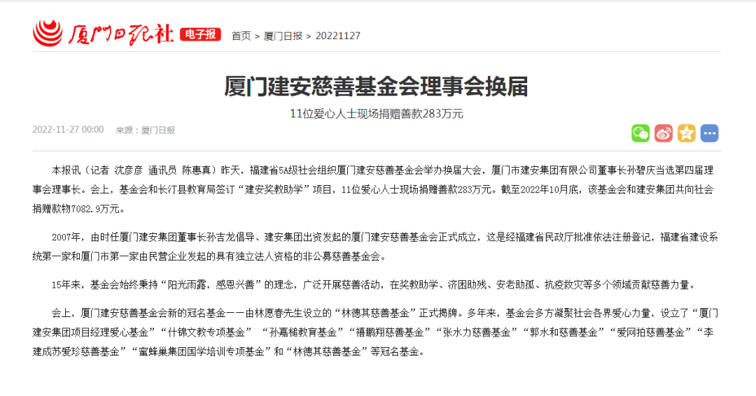 “項目經(jīng)理愛(ài)心基金”是廈門(mén)建安集團的項目經(jīng)理們在公司的倡議下設立的,為更好地發(fā)展壯大基金,提升品牌效應,更名為“廈門(mén)建安集團項目經(jīng)理基金”。廈門(mén)港務(wù)建材供應鏈有限公司總經(jīng)理林愿春捐資50萬(wàn)元,以其父親林德其先生的名字在基金會(huì )設立冠名基金。